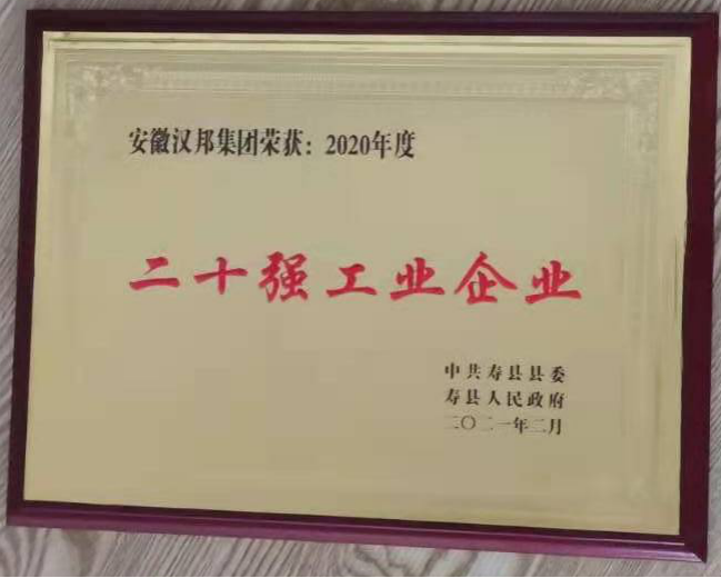 2021年2月23日,壽縣縣委、壽縣人民政府在壽縣大劇院舉行2020年度二十強工業(yè)企業(yè)授牌頒獎儀式。會上,安徽漢邦集團再次被授予“二十強工業(yè)企業(yè)一等獎”,這是我公司自2014年以來,連續(xù)六年榮獲該榮譽。