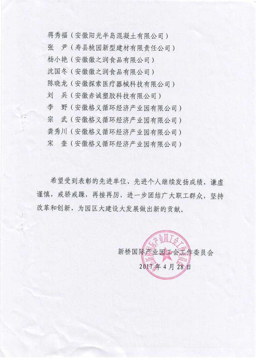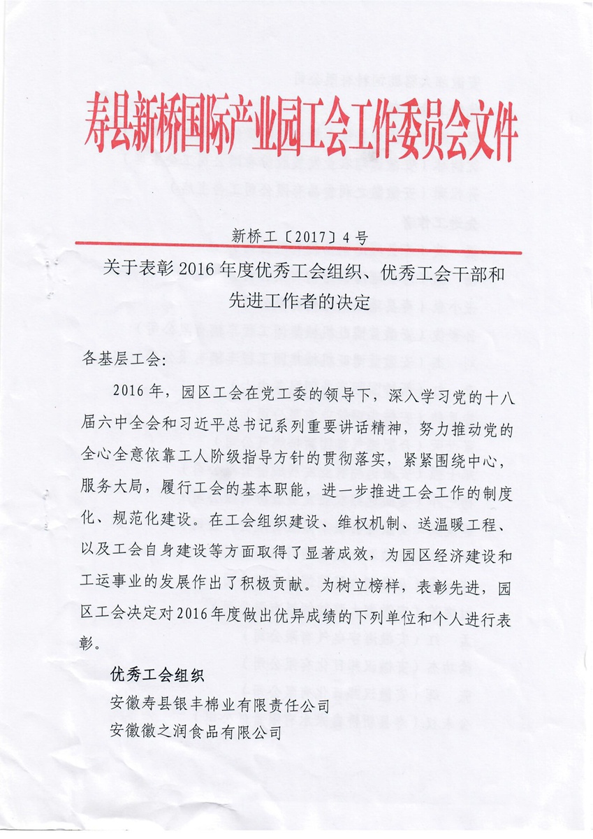 2016年度先進工作者表彰文件(壽縣新橋國際產(chǎn)業(yè)園工會工作委員文件)